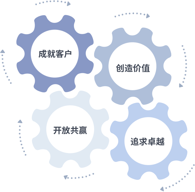 成就客户是一切决策的出发点,创造价值是衡量所有工作的标准,追求卓越是ss3333盛世集团做事做人的态度,开放共赢是ss3333盛世集团的格局也是最终的结果。价值观的齿轮环环相扣,推动着组织里的每个人不断向前。